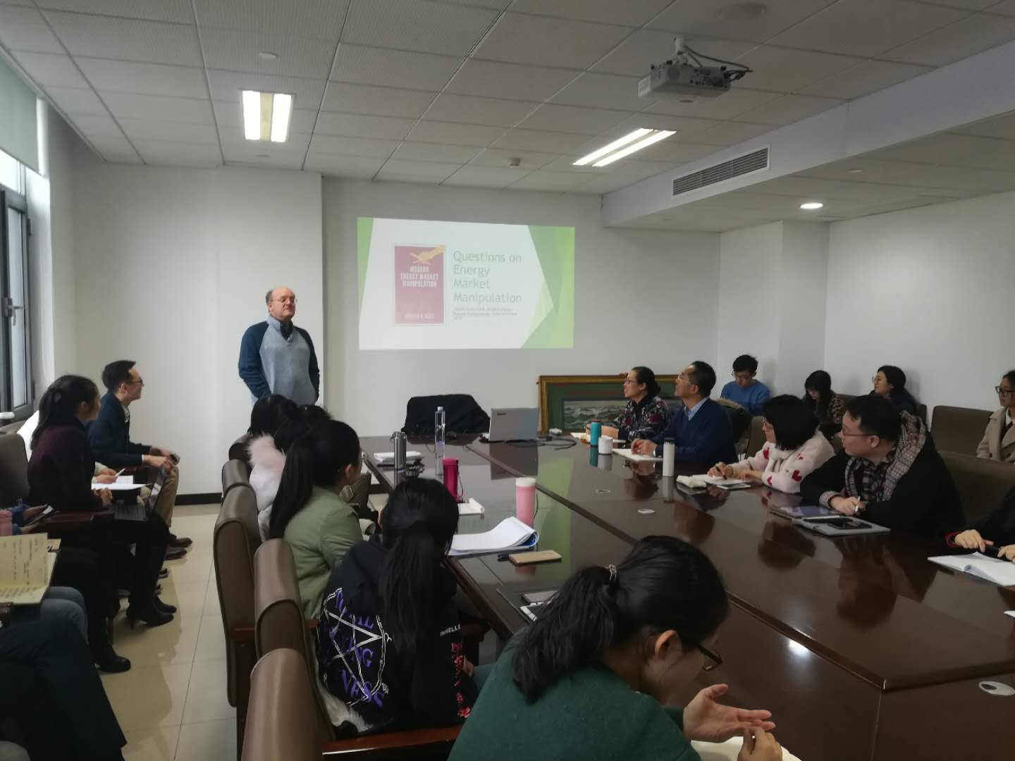Andrew教授首先解釋了市場操縱的具體內涵,然后例舉了加拿大公司Bre-X等市場操縱有關的案例。隨后,博士生孫楚鈺做了題為“考慮可再生能源電力市場機制設計成本效益分析”的報告。通過建立包含中長期交易市場出清等多種模型,進行不通電力市場機制設計下的電力市場交易仿真,對比分析了三種電力市場機制對燃煤企業、可再生能源市場和電力產業的影響。