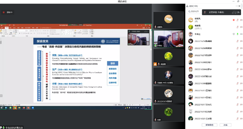 圍繞“政府-供應鏈”之間的降碳減排政策和企業應對配合這一研究主題,牛教授介紹了三篇研究。他分別從采購-生產-分銷三個代表性環節提煉科學問題,構建競合博弈模型,找出企業增收與降碳減排帕累托改進空間,展開具體的探索性研究,并對管理啟示進行了總結,其一為考慮零配件回收補貼和成品碳稅的再制造競合供應鏈協調策略;其二為考慮碳鎖定難題的跨國公司離岸生產和轉廠籌劃策略;其三為考慮歐盟“碳中和”規制的新能源車和燃油車競合分銷策略。