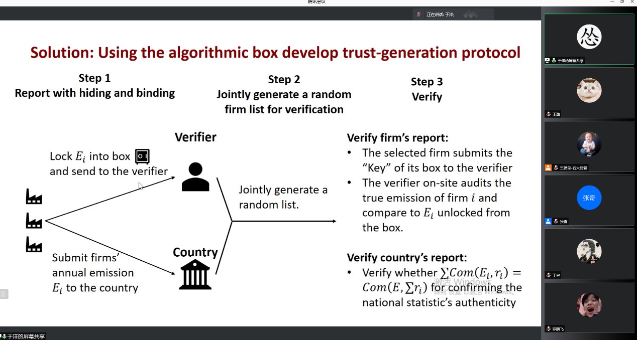 清華大學交叉信息研究院的于洋就“能源系統的數據質量與價值”這一主題進行了演講匯報。于教授在報告中分享了他們團隊將密碼學應用到碳核查、碳管理上的相關成果,通過構建的密碼系統將碳核查者和國家之間的互信問題轉化為數學上獲得真正隨機數的問題從而解決碳核查的能源數據安全問題。