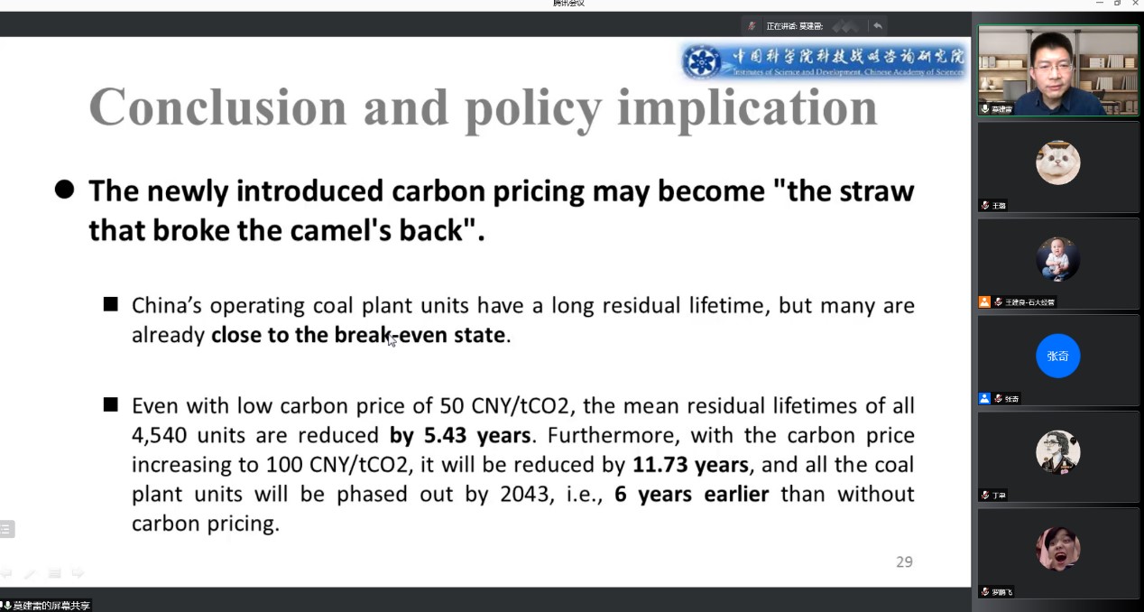 中國科學院科技戰略咨詢研究院的莫建雷分享題為“全國碳定價與化石能源資產擱淺風險”的研究。該研究以多因素考慮石油資源擱淺風險,并給出了碳定價的引入對火電機組、煤電機組影響結果分析,以及全國29個省份之間的異質性分析。