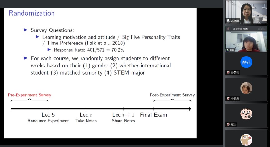 在本次報告中,劉教授介紹了利用田野實驗方法研究學生被要求記筆記這種課堂介入手段對于提高學生簽到率與學習成績的作用。她的研究主要是為了回答三個問題:第一,哪個時間段實施課堂介入手段能獲得最好的影響?第二,哪一類學生受到課堂介入手段的影響最大?第三,課堂介入手段是否有效?從上述三個問題出發,劉教授首先介紹了田野實驗設計,詳細講述了實驗分組、實驗實施過程與實驗問卷等內容,并給出田野實驗應該降低實驗對象所付出的成本,使其處在一個弱實驗情景的建議。在此之后,劉教授介紹了其研究的初步結論,認為課程中段時要求學生記筆記對學生的簽到率與課程成績影響最大,同時非第一時間選課的學生更容易受到這一作用的影響。