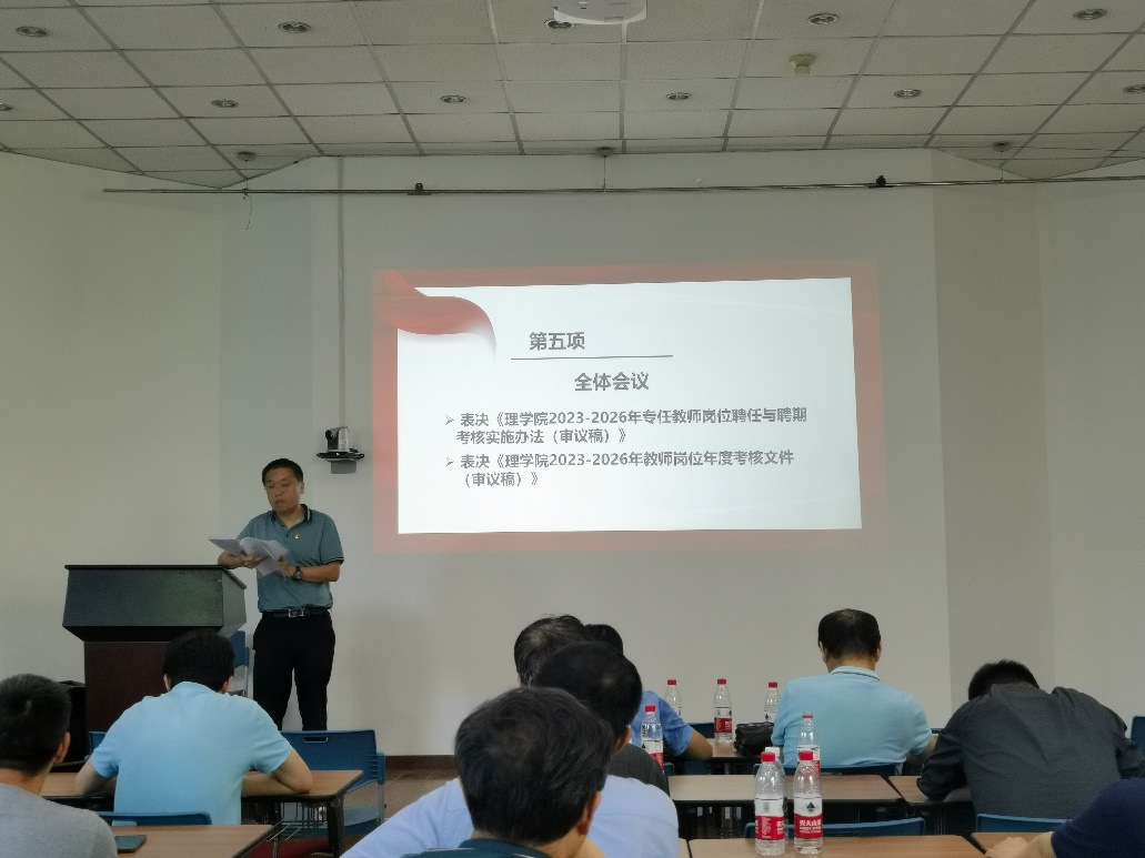 大會的主要議題聽取和討論《理學院2023-2026年專任教師崗位聘任與聘期考核實施辦法(征求意見稿)》、《理學院2023-2026年崗位年度考核工作實施辦法(征求意見稿)》。