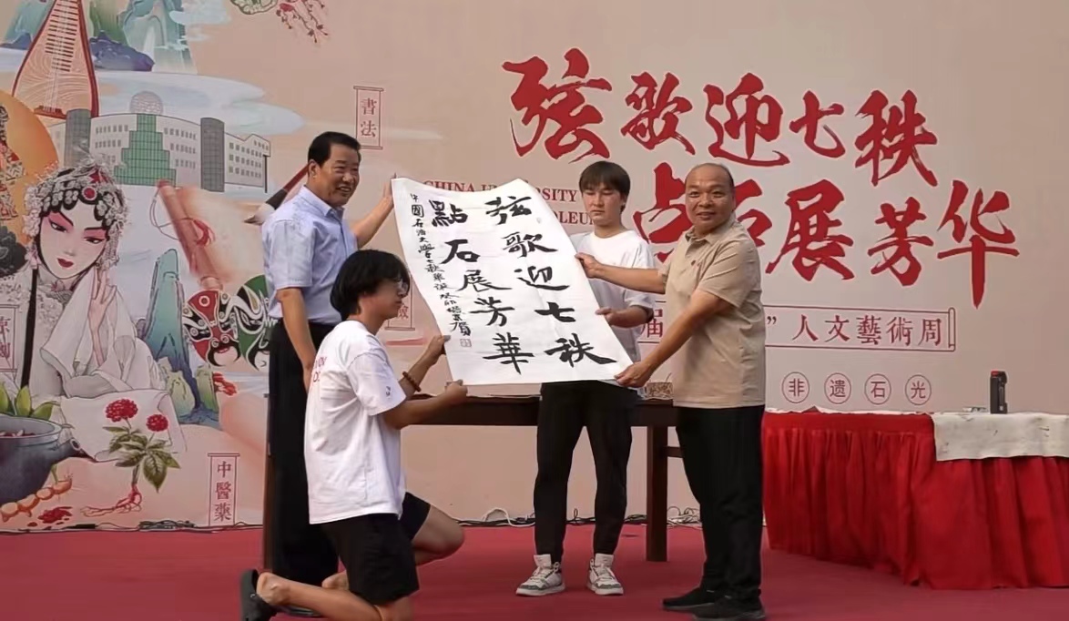 “我在現場與書法家共同書寫了“芳華守藝,非遺石光”,希望通過筆墨傳承中華優秀傳統文化,表達對母校七十歲生日的祝福!”