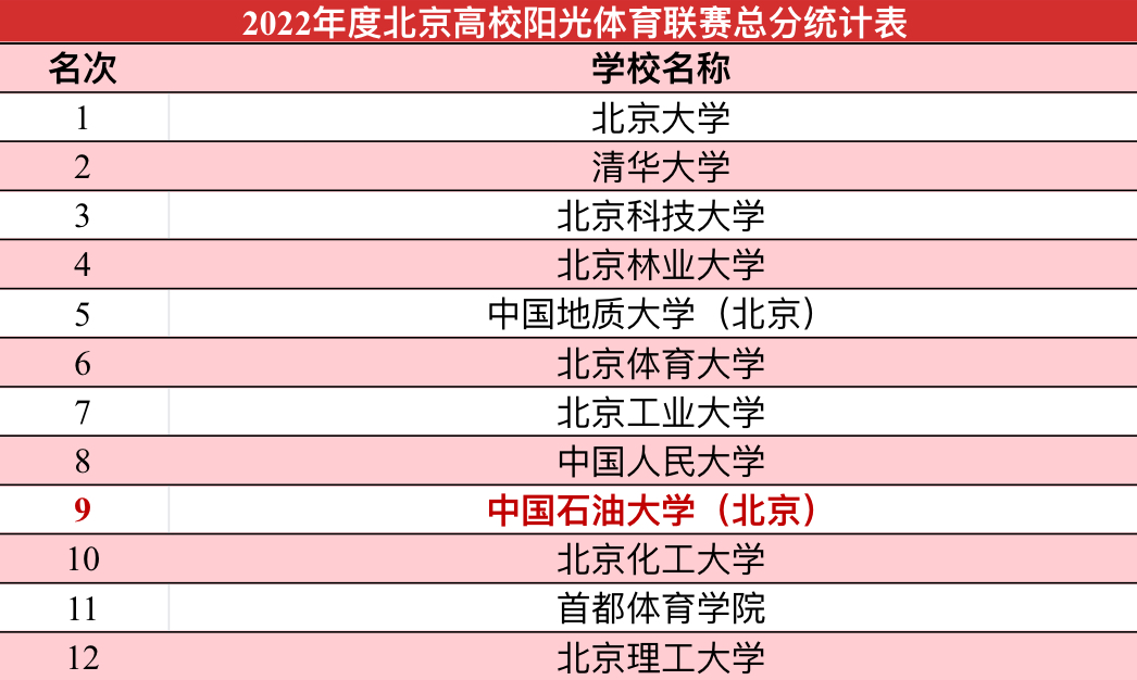 3月11日,北京市大學生體育協會第六屆四次理事(擴大)會議順利召開,我校體育與人文藝術學院相關代表參加了此次會議。本次會議總結了過去一年北京市大學生體育活動的整體工作,表彰了陽光體育聯賽優勝學校,我校包攬了2022年首都高等學校陽光體育“朝陽杯”和“陽光杯”全部榮譽。為促進首都高校體育工作,北京市教委設立了“朝陽杯”與“陽光杯”兩個獎項。我校在首都高等學校2022年“朝陽杯”陽光體育聯賽中積分得792分,獲得甲組第六名。在“陽光杯“中積分得1279分,獲得第九名。近年來,我校落實立德樹人根本任務,將體育課堂教學與校內外群體競賽相結合,積極推動各項大學生體育賽事,構建校園群體競賽新體系,促進課程、社團、代表隊競賽與“陽光體育”鍛煉等課內外一體貫通,已經取得了一系列的成績,期待未來可以創造更多的成績與突破。