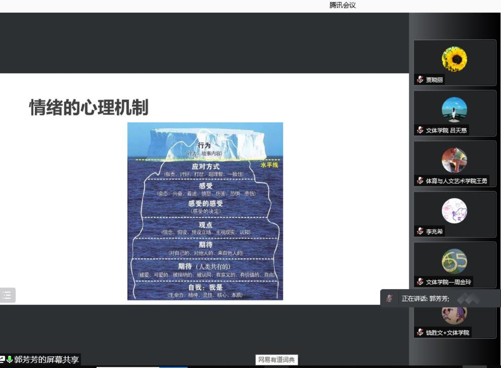 為了幫助學(xué)院教師更好地應(yīng)對生活、工作等方面的壓力,做好情緒管理,建立健康的心理狀態(tài),體育與人文藝術(shù)學(xué)院與機(jī)械與儲運(yùn)工程學(xué)院于12月2日聯(lián)合舉辦了線上心理健康輔導(dǎo)講座。本次講座邀請了北京師范大學(xué)發(fā)展與教育心理學(xué)博士、國家二級心理咨詢師郭芳芳老師,文體學(xué)院和機(jī)械學(xué)院近百位教師參加了本次講座。