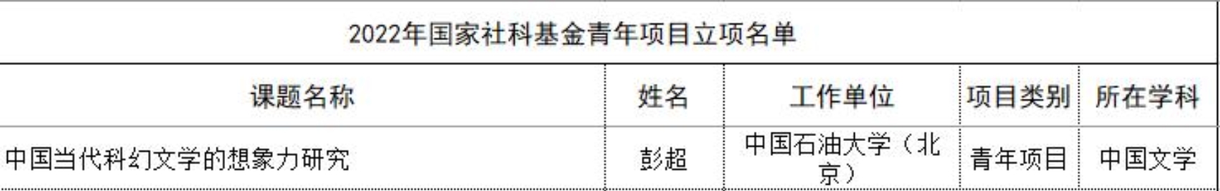 近日,全國哲學社會科學工作辦公室網站發布了2022年度國家社科基金年度項目、青年項目立項公示名單,我校今年共獲批國家社科基金項目立項2項。我院青年教師彭超申報的《中國當代科幻文學的想象力研究》獲得國家社科基金青年項目立項。這是我院首次獲得國家社科基金項目立項。
