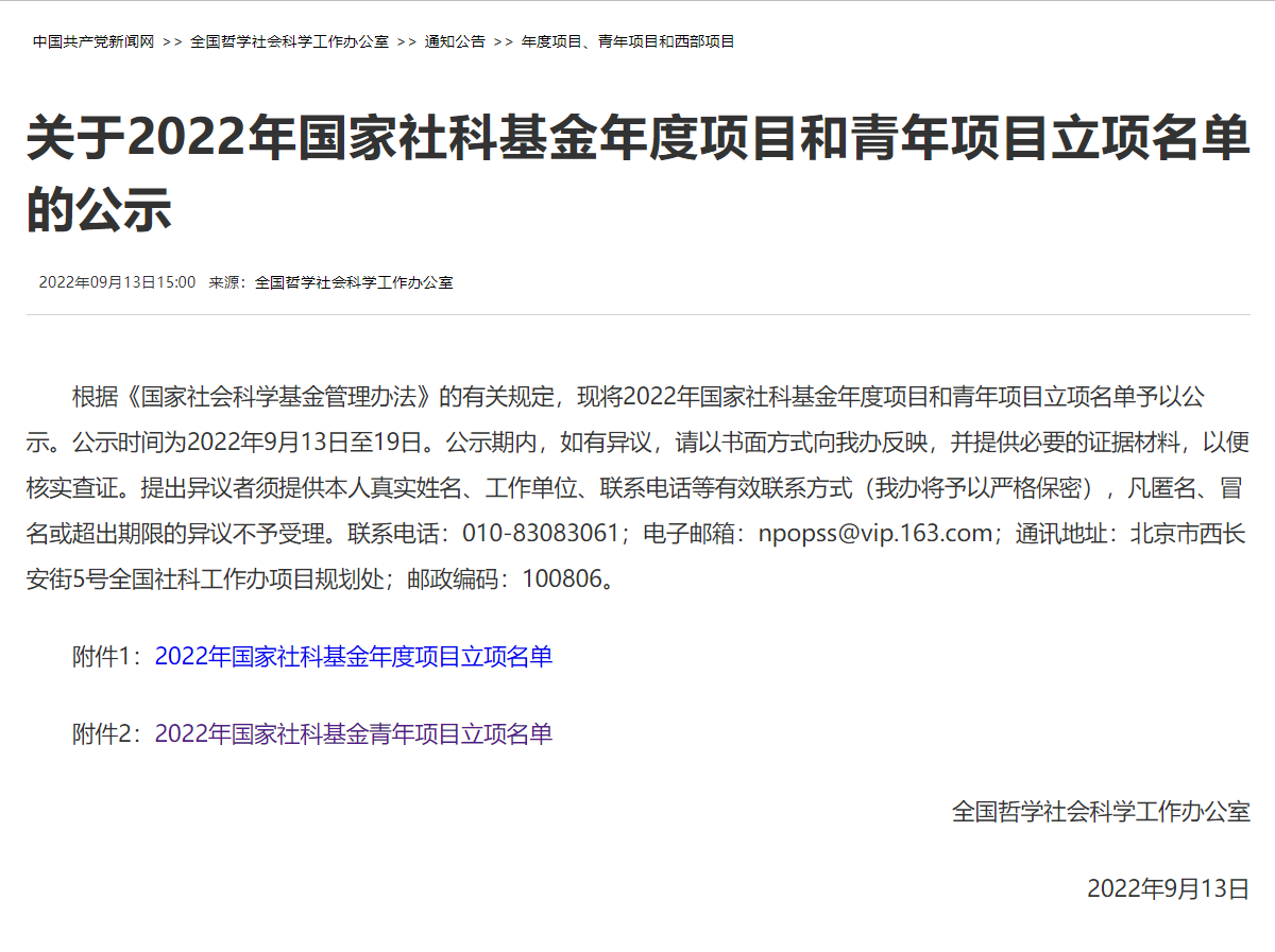 鏈接:關于2022年國家社科基金年度項目和青年項目立項名單的公示