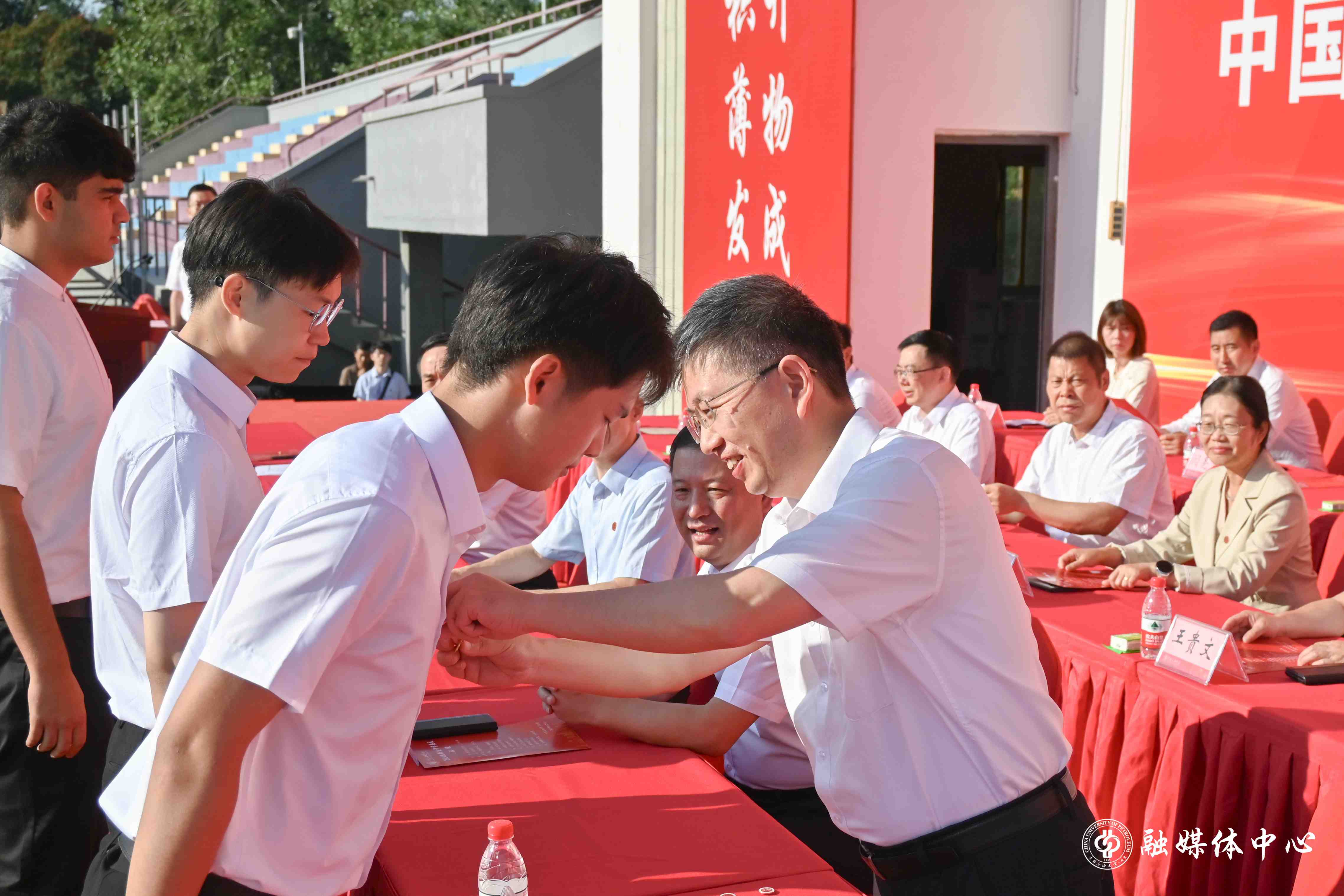 金衍為新生代表們佩戴校徽。新生胸前徽章熠熠閃耀,宣示著又一批青春力量在中石大走上奮進之路、逐夢之旅。