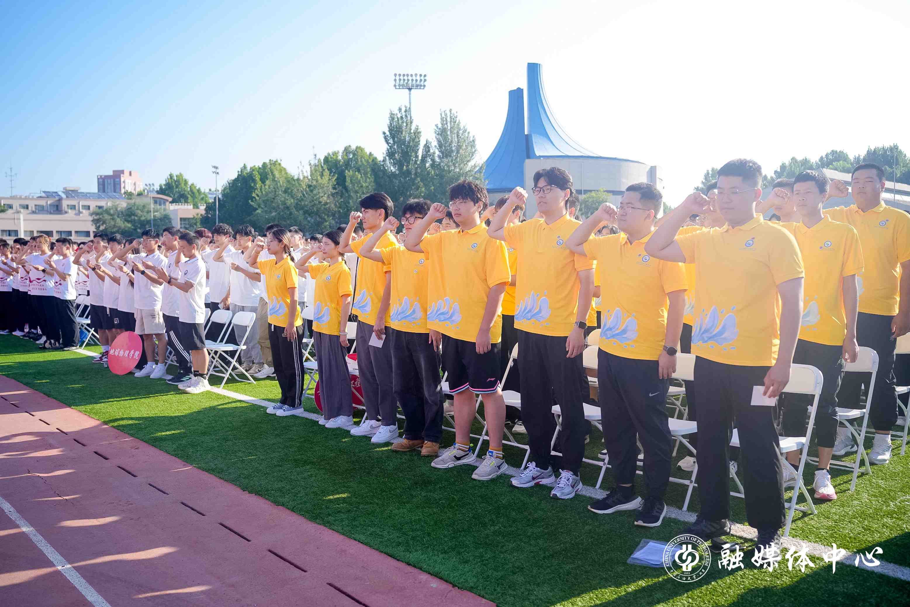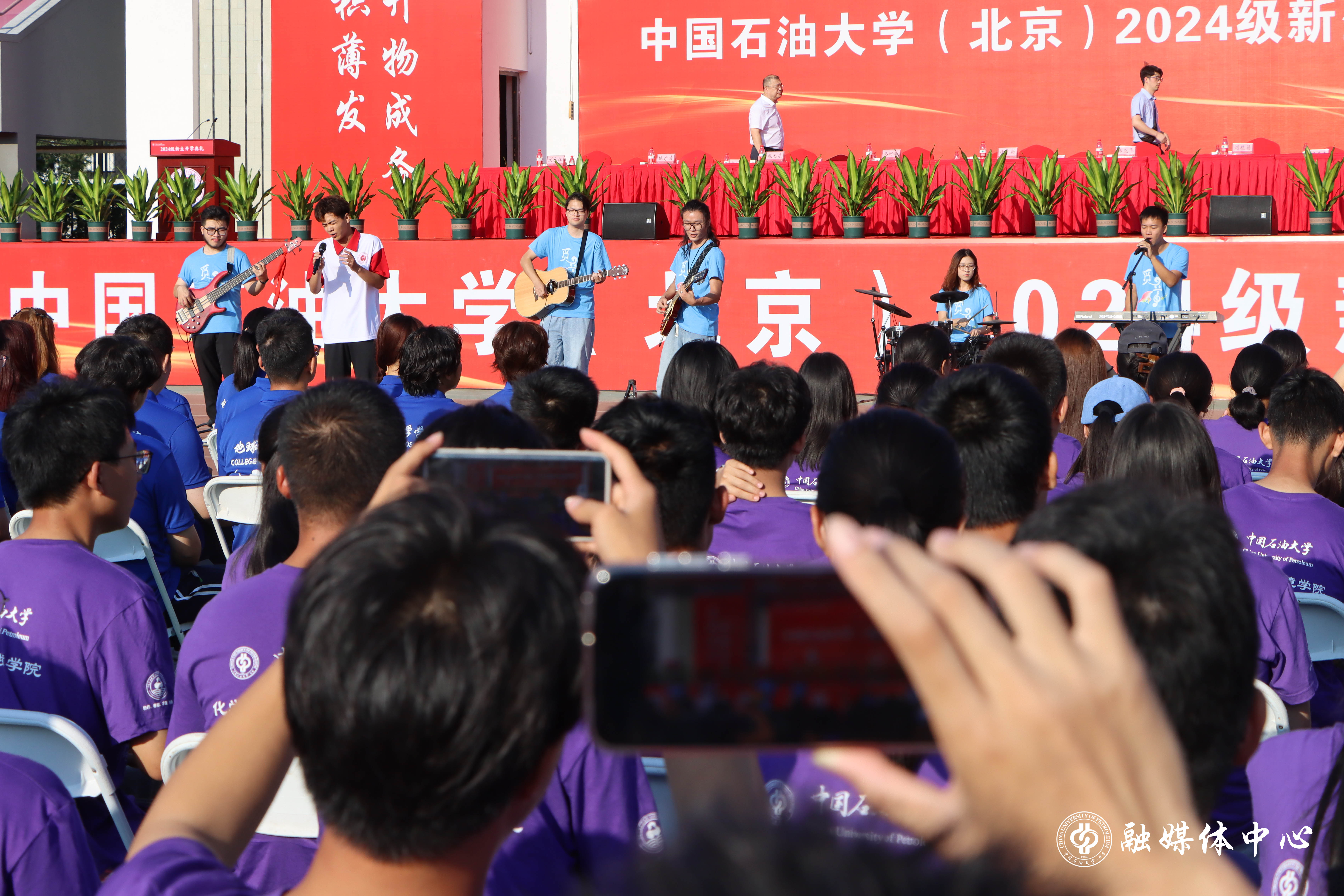 今年的開學典禮設置了暖場表演、新生佩戴校徽、新生入學宣誓等環節。來自中石大覓音社的同學們與新生代表一起,帶來了歡快的歌曲串燒表演。