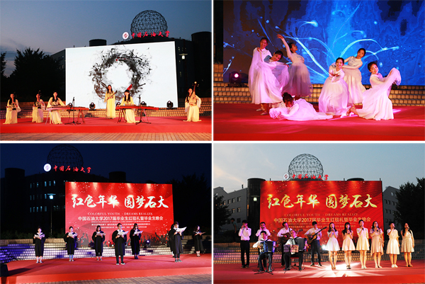 在畢業生晚會中,無論是小合唱《山楂樹》,唯美的舞蹈《清清克拉瑪依河》,還是民樂合奏《雨碎江南》,歌曲《一個人的北京》、《再見》,亦或是學生改編的石大版《成都》,畢業生創作的詩朗誦《昌平小事》,都表達了學生對母校的依依不舍之情。