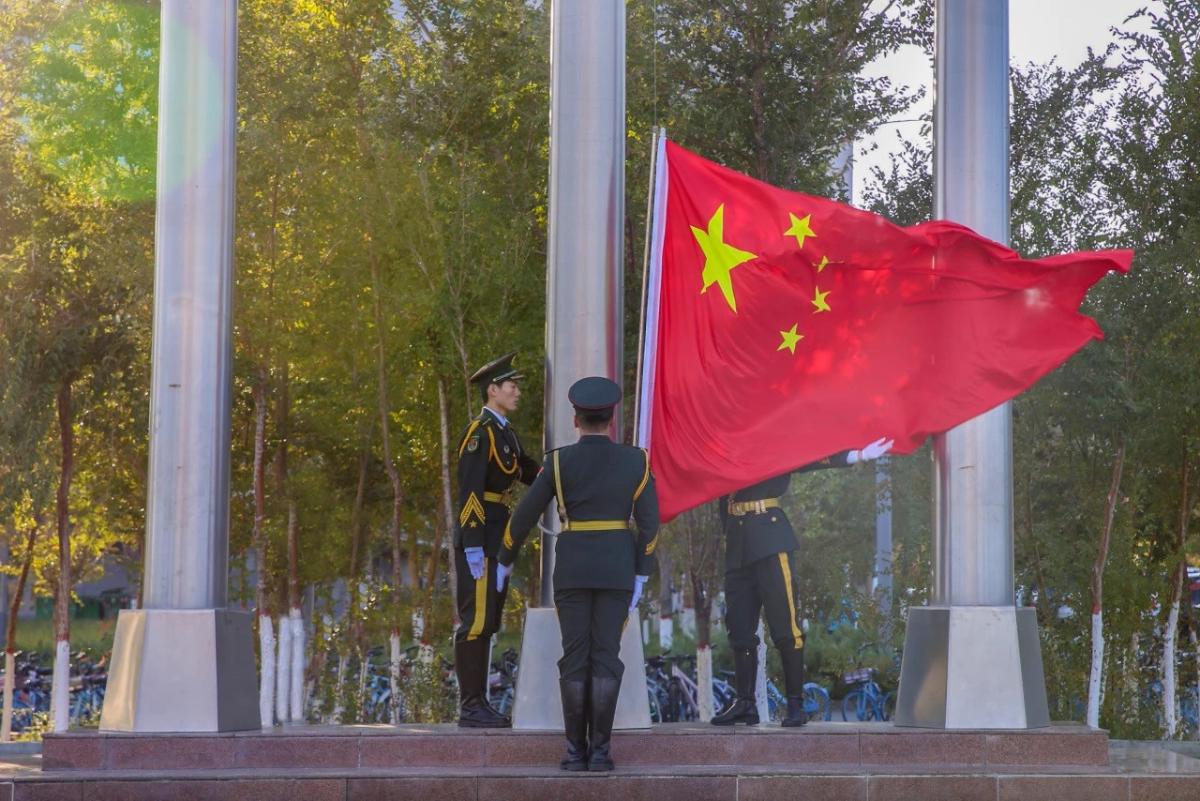 克拉瑪依校區也在紅旗操場舉行了國慶升旗儀式,全體在校新生和輔導員參加活動,高唱雄壯的國歌旋律,誦讀愛國詩篇《我的祖國》,活動現場涌動著澎湃的愛國熱情。