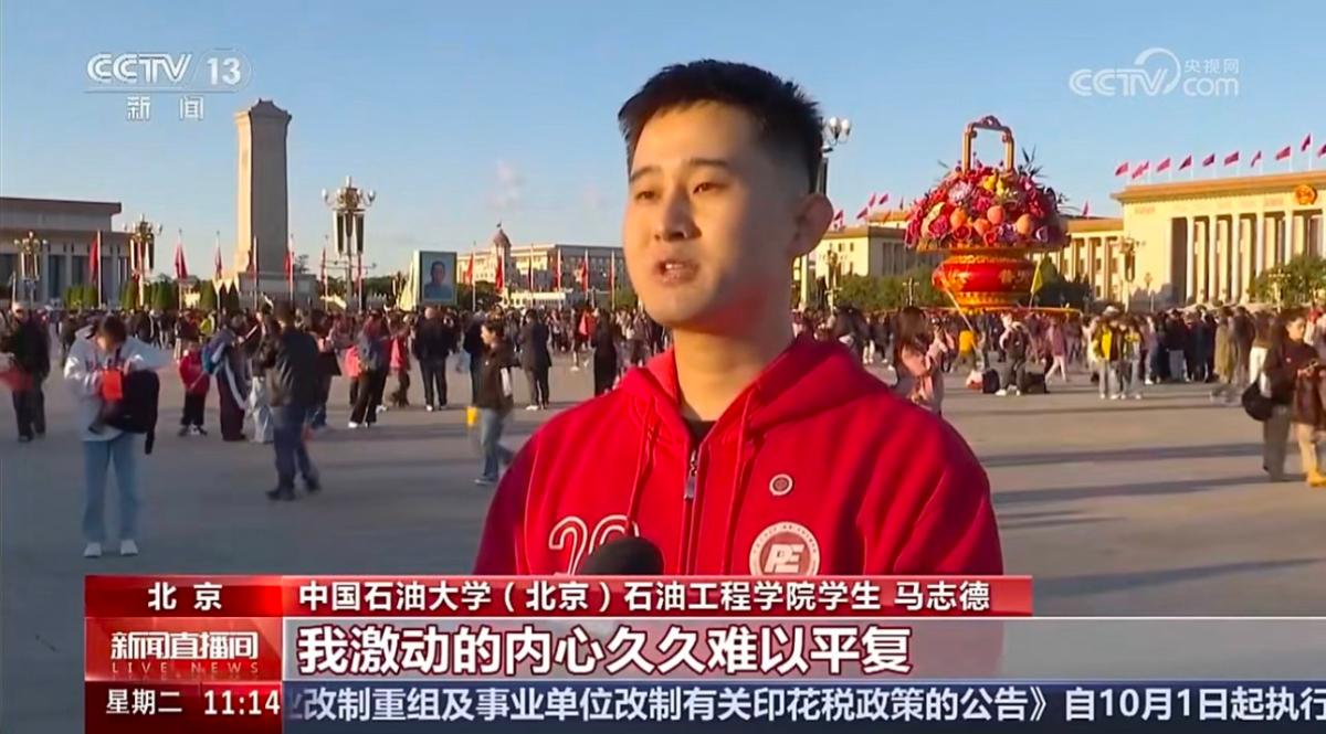 10月1日,天安門廣場舉行了2024年國慶升國旗儀式,迎著清晨的第一縷陽光,在雄壯的國歌聲中,五星紅旗冉冉升起。來自新能源與材料學院、夢溪書院200名師生代表與來自首都近2000名大中小學生共同赴天安門觀禮臺觀看升旗儀式;還有一批同學自發前往觀看升旗儀式。中央電視臺進行了全程記錄采訪,李榮博、王由、楊昊澎、楊建明、王子豪、馬志德、潘敬淇等同學接受了央視記者采訪,表達了牢記習近平總書記囑托,用奮斗書寫無悔的青春,為祖國能源事業貢獻力量的決心。