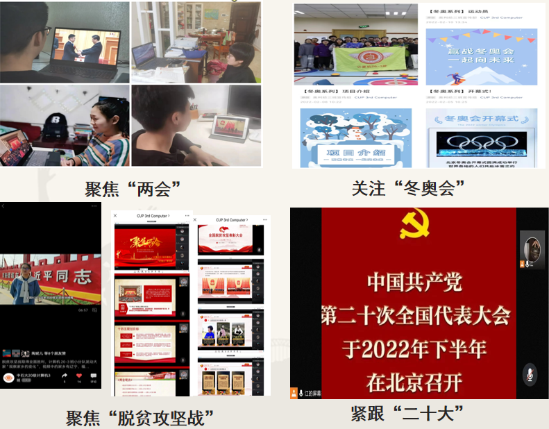 計算機20-3團支部關注時事,定期學習黨的理論知識。先后組織學習“脫貧攻堅戰”“兩會”“冬奧會”“建團百年講話”“二十大”等熱門時事,深入學習宣傳貫徹習近平新時代中國特色社會主義思想,不斷提高思想政治水平。并針對每個專題學習制作原創視頻五篇,發布在公眾號上,影響身邊更多的同學提高思想政治水平。