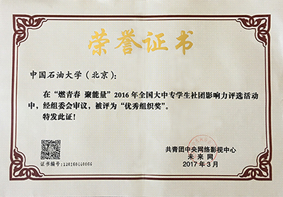近日,共青團中央網絡影視中心、團中央未來網公布了“燃青春 聚能量”2016年全國大中專學生社團影響力評選活動結果。石大獲2016年全國大中專學生社團影響力評選活動優秀組織獎,并有4家學生社團獲得優秀社團獎。