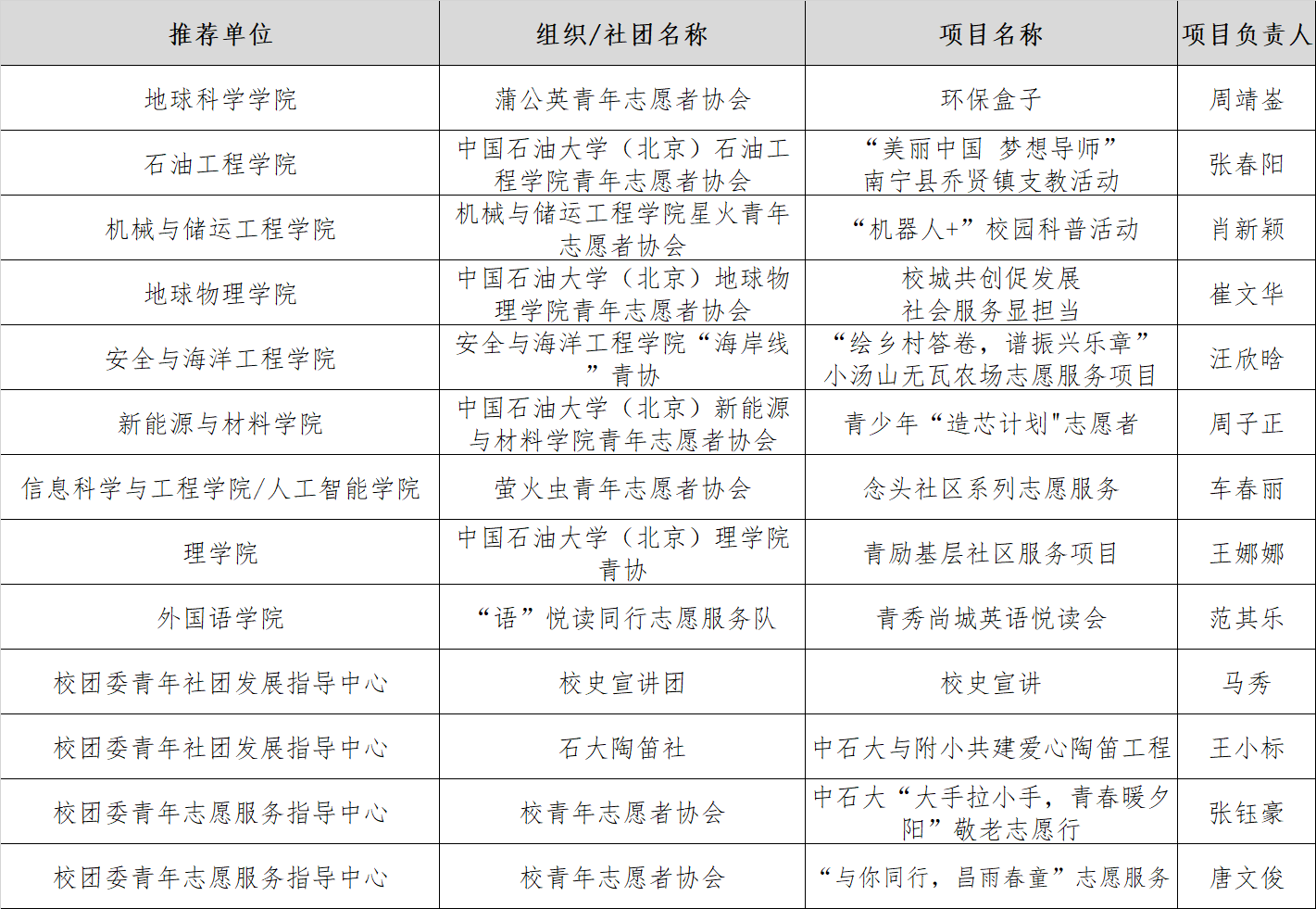 經(jīng)學(xué)生自主申報(bào),各學(xué)院(研究院)團(tuán)委(相關(guān)部門)推薦,校團(tuán)委青年志愿服務(wù)指導(dǎo)中心審查推薦材料及相關(guān)數(shù)據(jù),確定了進(jìn)入2022-2023年度中石大優(yōu)秀志愿服務(wù)終選答辯的名單,具體如下所示: