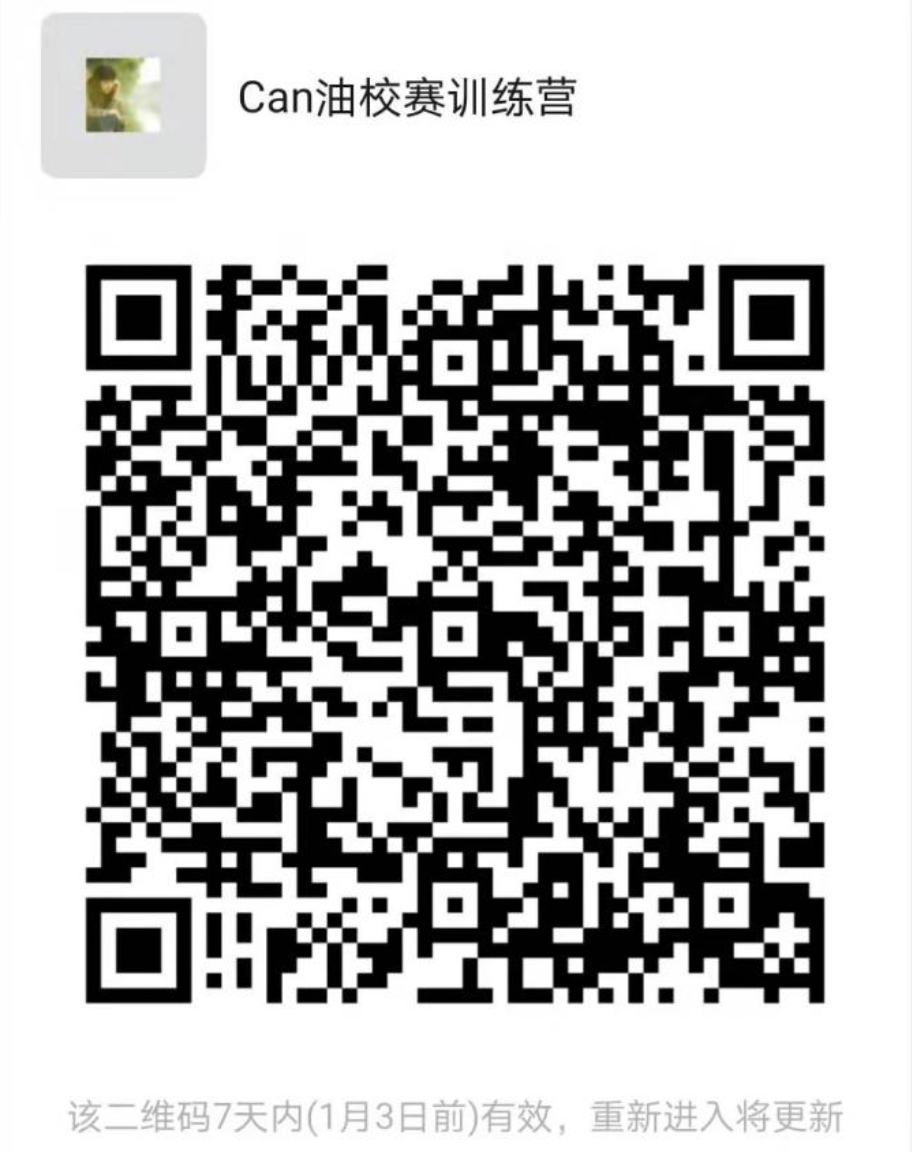 學校將重點關注成績排名前三十的項目小組,成績排名前六十的項目小組進入Can油校賽訓練營,請成績排名前六十的項目負責人掃碼進群(見圖1)并更改備注為“成績排名+姓名”以便后續交流。請加入訓練營的隊伍認真對待,后續將根據隊伍的實際能力及態度逐步篩選擇優。