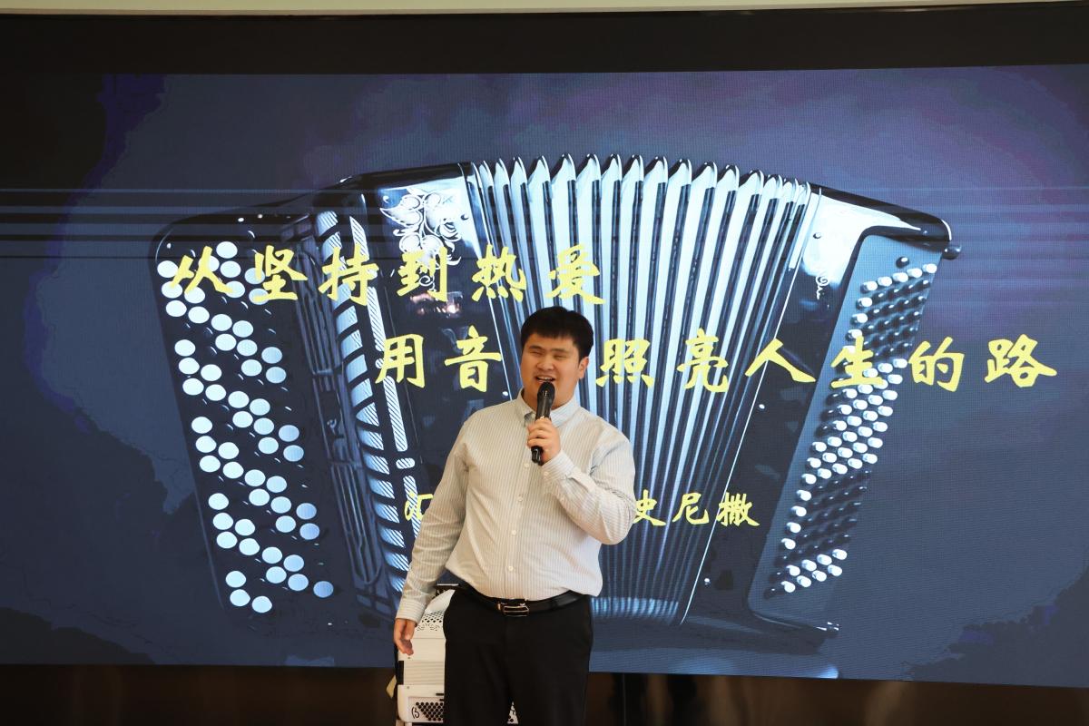 博史尼撒是一名彝族小伙,是四川殘疾人藝術團成員。他以幽默詼諧的方式,講述自己殘疾后不斷突破自我的經歷。上天奪走了他的雙眼,同時也賜予了他靈活的雙手。他在失敗中嘗試,在挫折中堅持,通過手風琴藝術走向更廣闊的天地。他希望那些同他一樣身處黑暗的人在熱愛中汲取能量,勇敢地追逐夢想之光。宣講最后,他還為師生們帶來手風琴獨奏《我為祖國獻石油》。