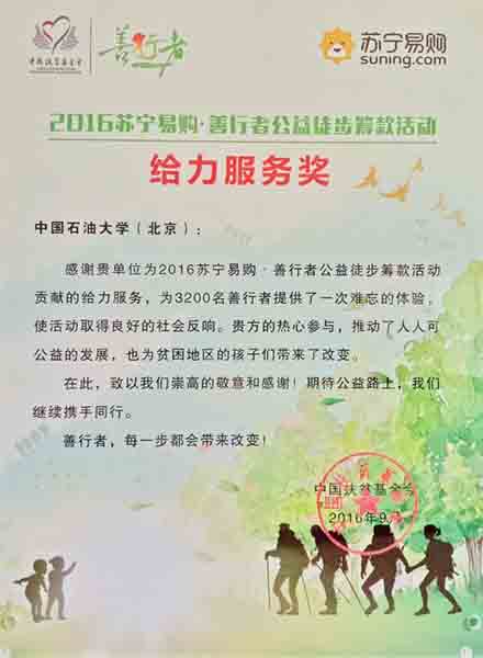 9月10日至11日,由中國扶貧基金會、昌平區人民政府聯合舉辦的2016善行者公益徒步活動在北京市昌平區舉行。中國石油大學459名志愿者全程參與并完成此次活動的頒獎、補給、義賣、引導等志愿服務工作,累計志愿服務時長超過6000小時,服務參賽人員超過3000人次。隨后,主辦方為活動中做出突出貢獻的愛心企業、愛心媒體、志愿者團隊分別進行了表彰,石大志愿者團隊榮獲2016善行者公益徒步活動“給力服務獎”。