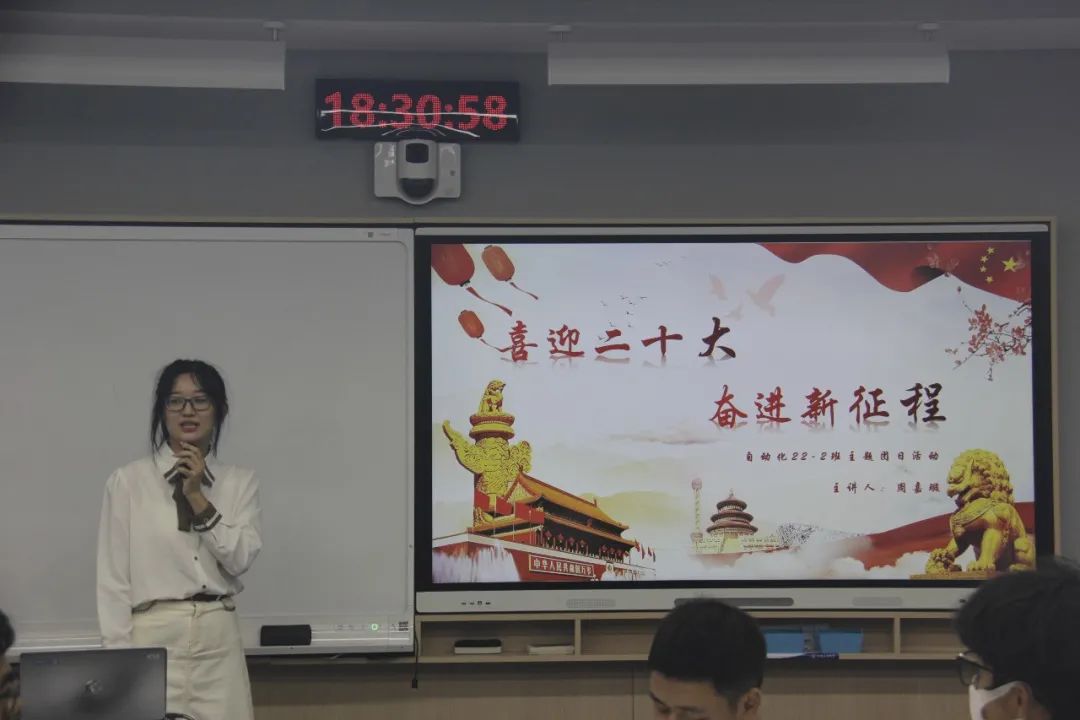 首先,學院電子19-1團支部書記周嘉璇與自動化22-2團支部全體團員共同帶來了“喜迎二十大 奮進新征程”主題團日示范課。她運用重溫誓詞、理論講解、知識競答、游戲互動等常用活動形式,生動的演示了如何舉辦一個有團味的團日活動。