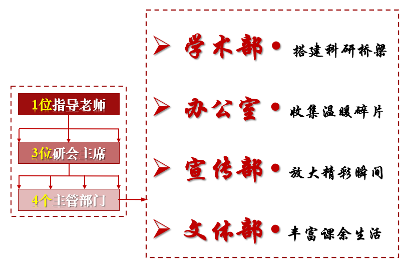 石工研會建立1位老師指導3位主席分管4個部門工作的“1+3+4”型組織管理模式,打造多方位、有特色的創新型學生組織。部門各司其職,相互協作,使學術與生活交融,科研與藝術邂逅,在熱情與才華的碰撞中釋放壓力,推動研會各項工作順利展開。