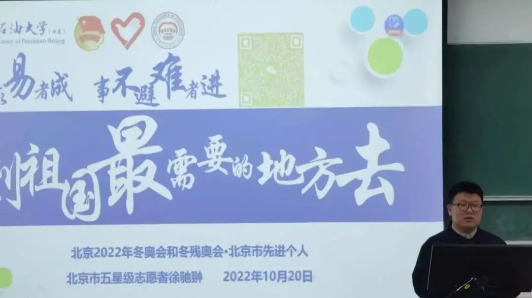 徐馳翀以“讓青春在奉獻中閃光”為主題進行宣講,為新生講述了在北京冬奧會中擔任志愿者的寶貴經歷,回顧了線上支教過程中為留守兒童帶來幫助的的自豪與滿足,鼓勵新生們積極參加志愿活動,并分享了豐富的志愿活動經驗與成功事例。
