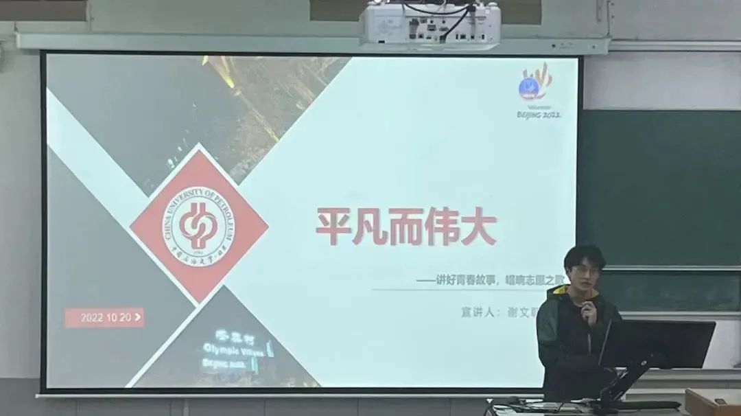 謝文朝陽以“平凡而偉大”為主題進行宣講,圍繞著冬奧賽事中不為人知的“四個他”展開講述,向新生們介紹了在志愿者背后的工作人員們,“他”們默默無聞的為志愿者們提供者最細心、最周到的服務,以自己的行動踐行著北京冬奧精神。