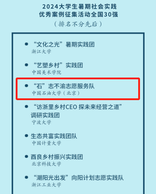 今年暑假,浙江日報潮新聞推出2024年大學生暑期社會實踐優秀案例征集活動,共吸引全國近千支實踐團隊報名,通過團隊自薦、材料審核、專家評審,評選出前30強優秀社會實踐隊伍。近日,評選結果揭曉,中國石油大學(北京)“石”志不渝志愿服務隊入選。