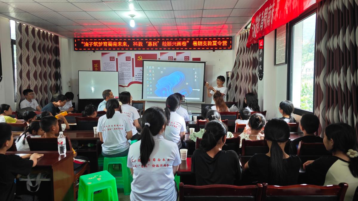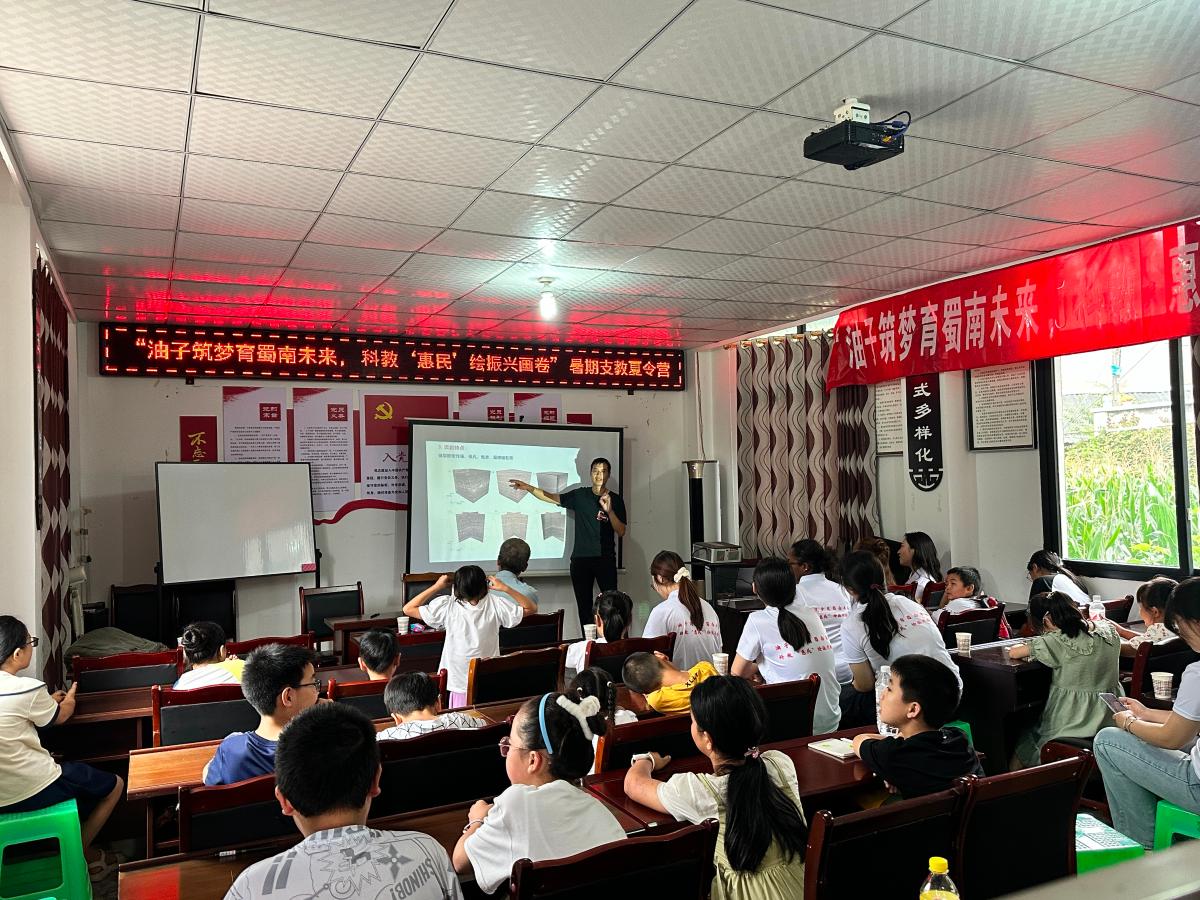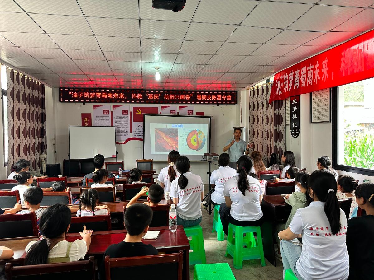 當(dāng)日下午,“油子筑夢(mèng)育蜀南未來,科教惠民繪振興畫卷”暑期支教夏令營(yíng)開營(yíng)儀式舉行。學(xué)校師生、珙縣底洞鎮(zhèn)政府相關(guān)人員、惠民村34名學(xué)生參加儀式。中石大教授團(tuán)隊(duì)為惠民村的孩子們科普了地球科學(xué)相關(guān)知識(shí),教授陳踐發(fā)講解了“石油的形成及其在日常生活中的用途”,副教授馬勇介紹了珙縣當(dāng)?shù)馗淮娴摹绊搸r及頁巖氣”相關(guān)知識(shí),特邀教師高峰帶來了一堂生動(dòng)的陶笛音樂課。