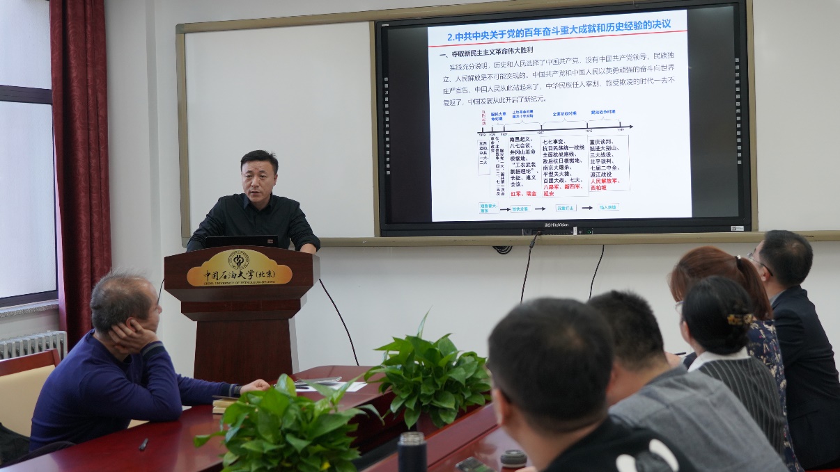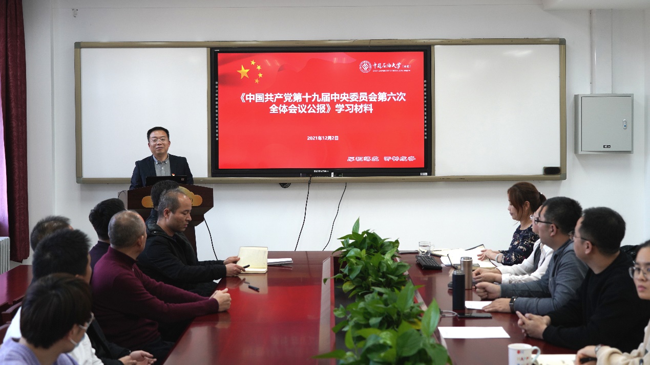 首先,網絡與繼續教育學院第一黨支部書記董剛同志導讀《中共十九屆六中全會公報》。董剛同志詳細介紹了六中全會的意義,公報內容、中央號召等問題,提醒黨員同志們一定要牢記:中國共產黨是什么?要干什么?這一重要初心使命。然后,石工學院油氣田開發第一黨支部書記趙曉亮同志對《中共中央關于黨的百年奮斗重大成就和歷史經驗的決議》進行導讀,再次帶領大家回顧了黨的百年奮斗重大成就與經驗。