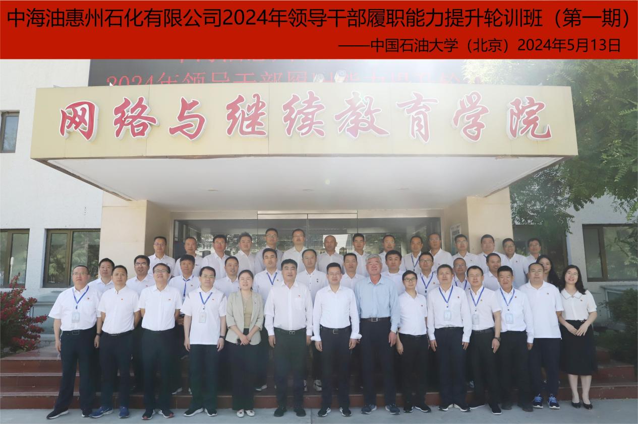 5月13日,中國石油大學(北京)承辦的“中海油惠州石化有限公司2024年領導干部履職能力提升輪訓班(第一期)”順利開班。中海油惠州石化有限公司總經理助理兼煤制氫部經理郭宗斌、中國石油大學(北京)黨委副書記文永紅出席開班式并講話,網絡與繼續教育學院院長陳桂剛主持開班式。