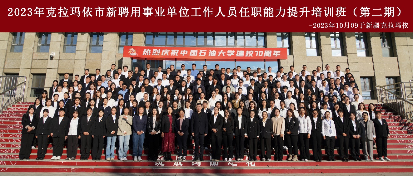 10月9日,由中國石油大學(北京)承辦的新疆維吾爾族自治區克拉瑪依市2023年新聘用事業單位工作人員任職能力提升培訓班(第二期)順利開班。新疆地區克拉瑪依市人社局楊爽楊科長,中國石油大學(北京)校區黨群工作部主任天山研究院副院長能源教授出席開班儀式。來自克拉瑪依市2023年新聘用的206名事業單位工作人員參加本次培訓。