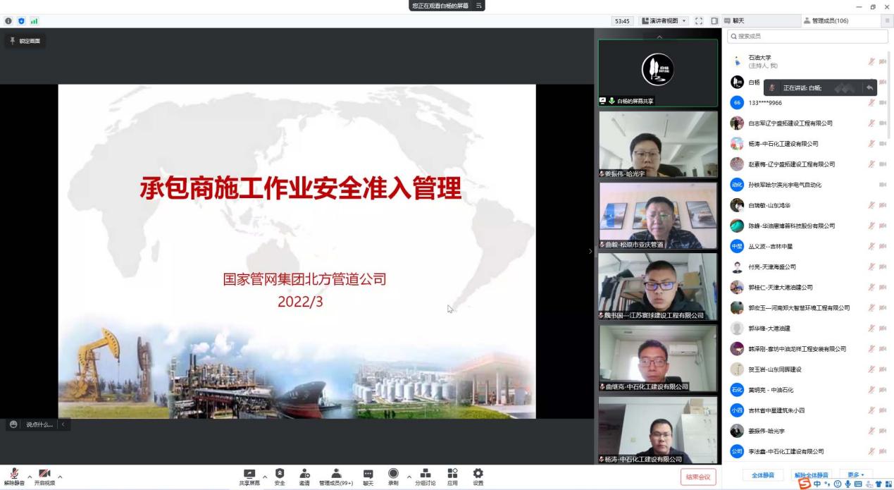本期培訓首次采用線上形式舉行,北方管道公司相關負責人致辭,并對學員們在安全培訓的重視度、安全學習的自覺性和疫情自我防控三方面提出要求。接下來,學員們將進行為期三天的培訓,內容主要包括北方管道公司承包商安全準入管理、高危作業安全管控、儲油罐大修理工程管理研討等。