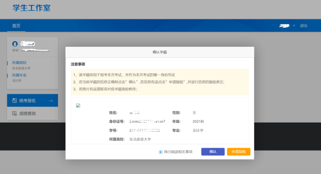 登錄完成后,系統(tǒng)會(huì)彈出“確認(rèn)學(xué)籍”信息窗口,請(qǐng)考生認(rèn)真核對(duì)姓名、身份證號(hào)碼、照片等信息,保證個(gè)人信息的真實(shí)、準(zhǔn)確、有效,確認(rèn)無誤后點(diǎn)擊“確認(rèn)”。如信息有誤可點(diǎn)擊“申請(qǐng)復(fù)核”進(jìn)行信息更正申請(qǐng)。(如考生照片有誤,則需聯(lián)系所在學(xué)習(xí)中心申請(qǐng)修改。)