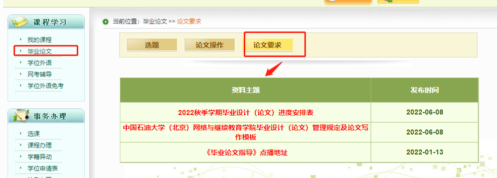 2.畢業(yè)設(shè)計(jì)(論文)管理規(guī)定、寫作模板、寫作指導(dǎo)等,可在“學(xué)生工作室→畢業(yè)論文→論文要求”欄目中查看。畢業(yè)設(shè)計(jì)(論文)管理規(guī)定和寫作模板也可參看附件2。