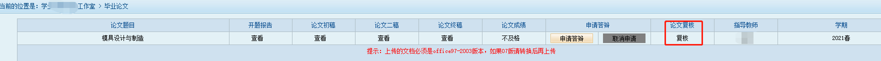 沒有給出及格成績的學生根據教師建議修改論文后在復核界面再次提交。 |