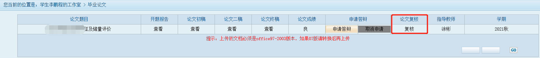 2.2022年春季及之前學期論文成績未及格或論文選題后連續兩個學期未完成論文寫作的同學,在平臺論文操作模塊點擊“復核”按鈕提交終稿稿件。復核具體要求以學院發布的正式復核通知為準。