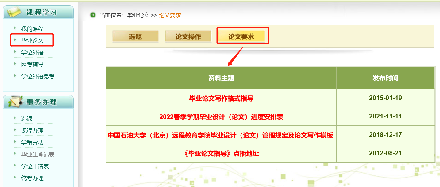 2.有關畢業設計(論文)的管理規定、格式規范、寫作指導等材料,同學們可在學生工作室→畢業論文→論文要求欄目中查看。