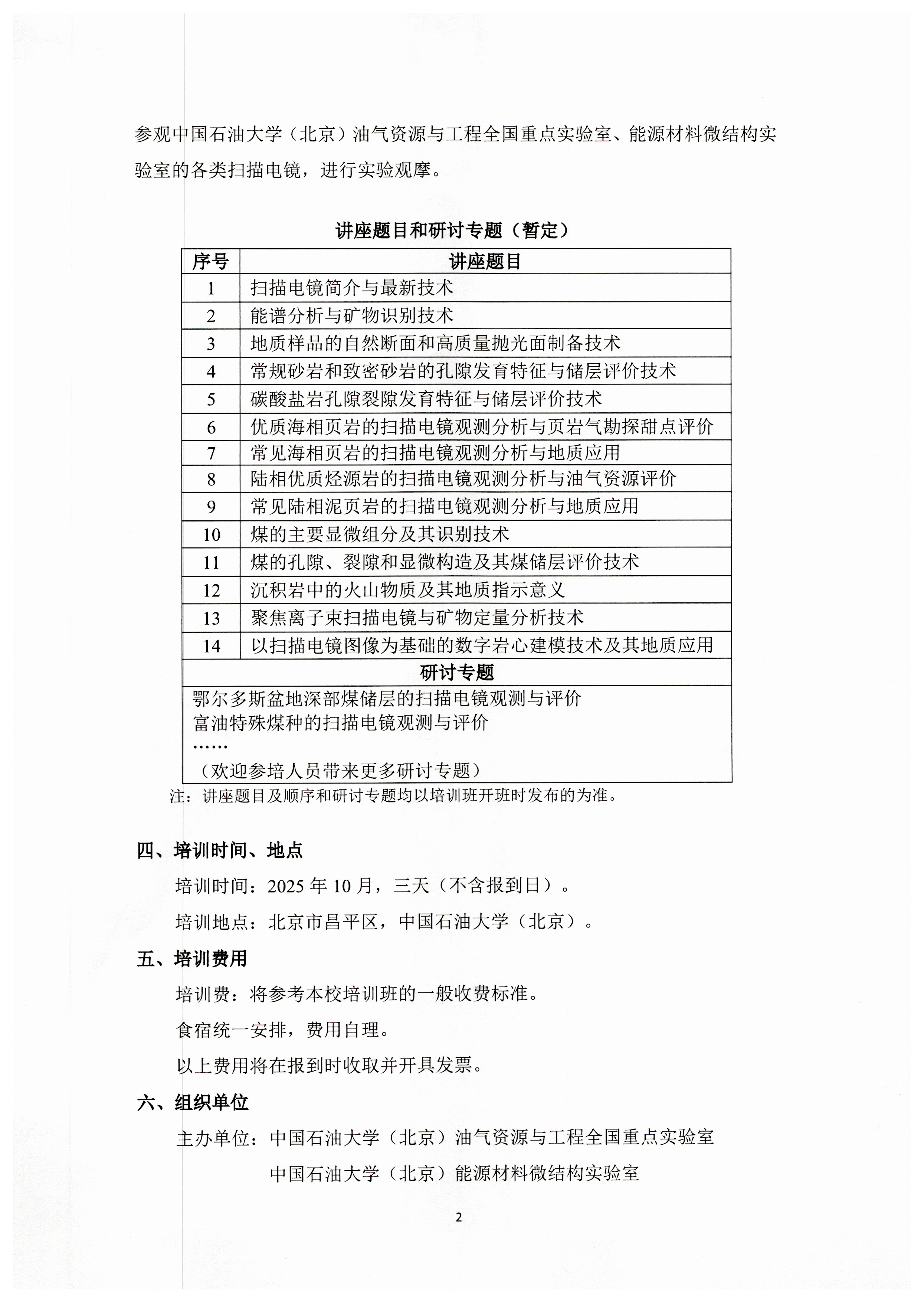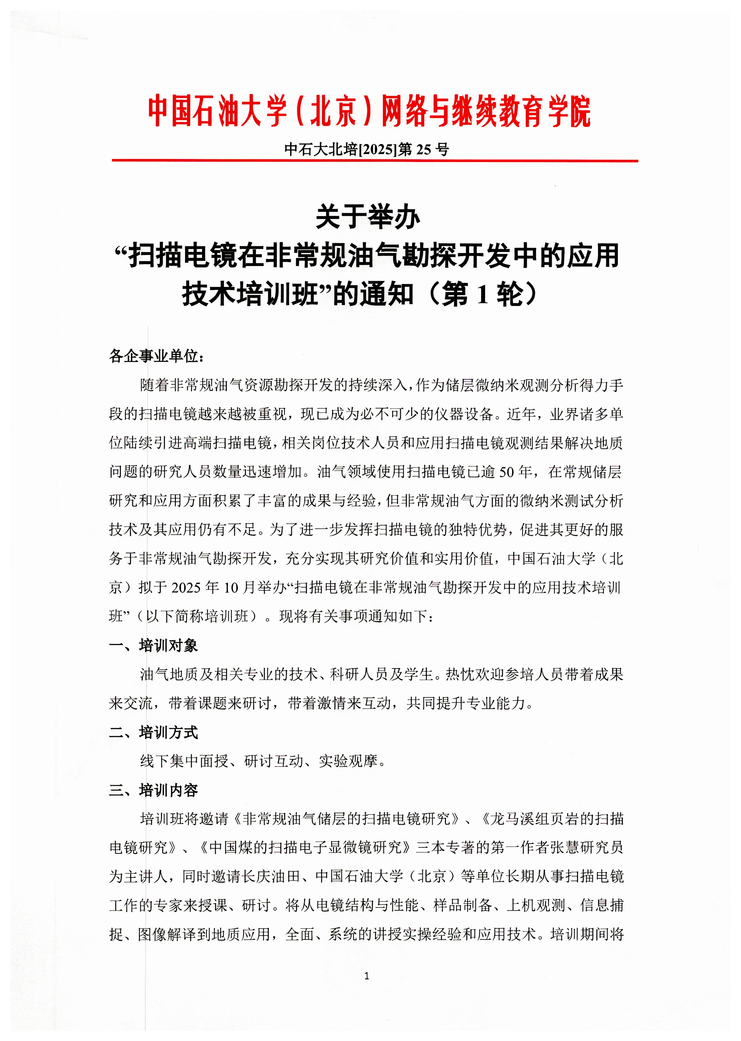 關于舉辦“掃描電鏡在非常規油氣勘探開發中的應用技術培訓班”的通知(第1輪)
