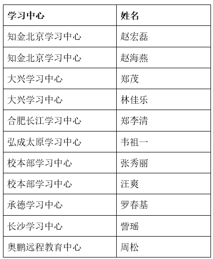 為了調動廣大學生的學習積極性,鼓勵優秀學生發揮模范帶頭作用,學院組織開展了2021春季評優工作。經過學生個人申報、學習中心初審、學院評審小組終審,最終評選出優秀畢業生11名。