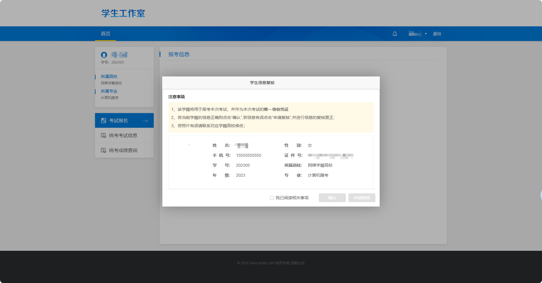4.請認真核對報名系統中的個人信息、照片及對應的考試科目等,確保信息完整、正確,以免影響考試。提交信息后,立即刷新頁面再次確認信息,如發現個人信息錯誤,請務必立即聯系學習中心申請修改。考試期間無法修改個人的錯誤信息。