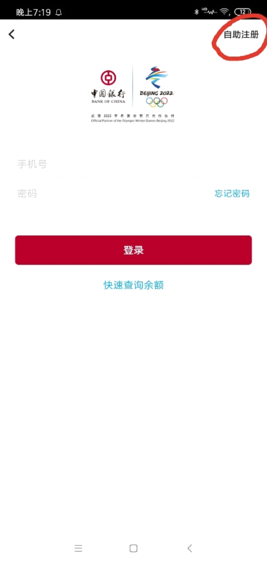 3.如無賬號密碼,請打開“中國銀行”APP后點擊左上角“登錄”選項后再點擊右上角“自助注冊”。輸入手機號、圖形驗證碼短信與短信驗證碼,點擊下一步后添加銀行卡進行綁定。