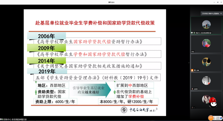 為幫助2020屆畢業生了解國家基層就業學費補償補償貸款代償政策,扎實做好我校畢業生基層就業學費補償貸款代償工作。6月10日,學生資助管理中心采用騰訊會議形式舉辦2020年畢業生基層就業學費補償貸款代償政策宣講會。學生資助中心全體人員、各學院(研究院)資助負責人、畢業班輔導員及200余名2020屆畢業生參加了會議。