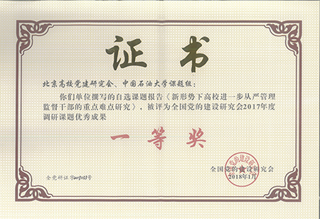 6月25日,北京高校黨建研究會成立30周年紀念大會暨北京高校黨建工作論壇在清華大學召開。會上宣讀了全國黨的建設研究會《關于表彰全國黨建研究會2017年度調研課題優(yōu)秀成果的決定》(全黨研文〔2018〕1號),中國石油大學研究成果《新形勢下高校進一步從嚴管理監(jiān)督干部的重點難點研究》獲得一等獎。
